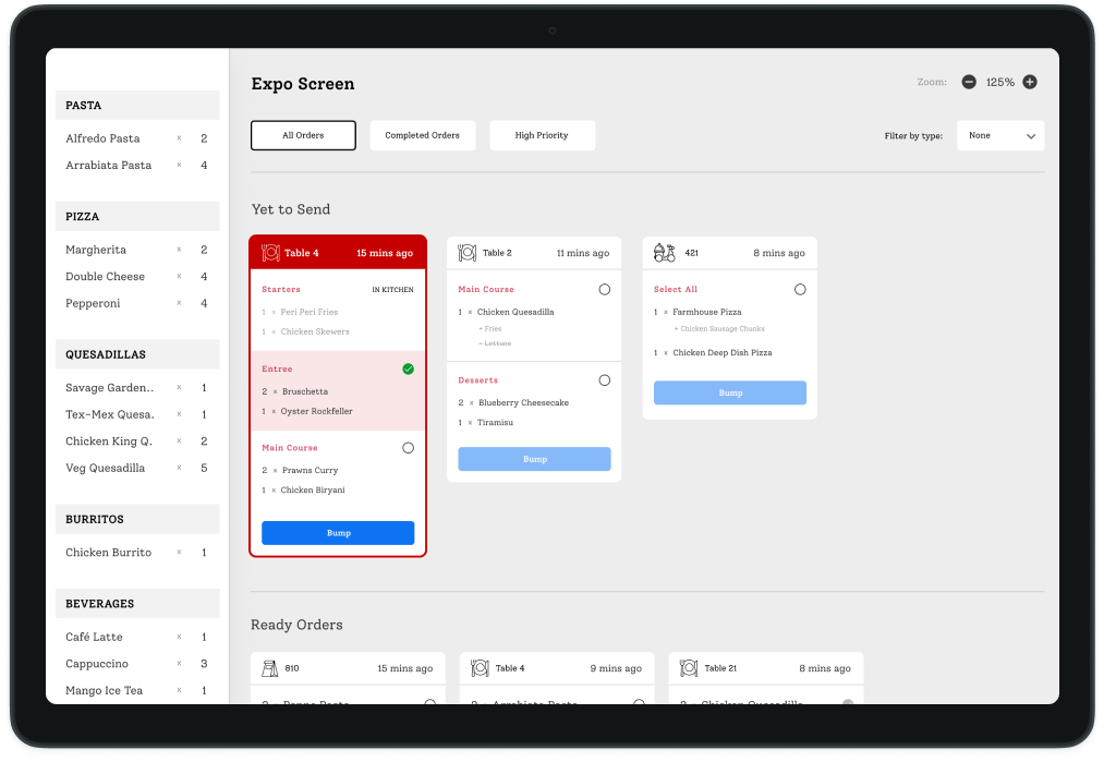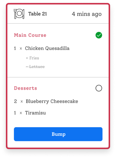 Empower your Expeditor with the ability to orchestrate the kitchen with finesse. Seamlessly bump orders to initiate the culinary journey. Prioritize items, reject completed ones when needed, and maintain impeccable control over the dining experience. Your kitchen, your rules.