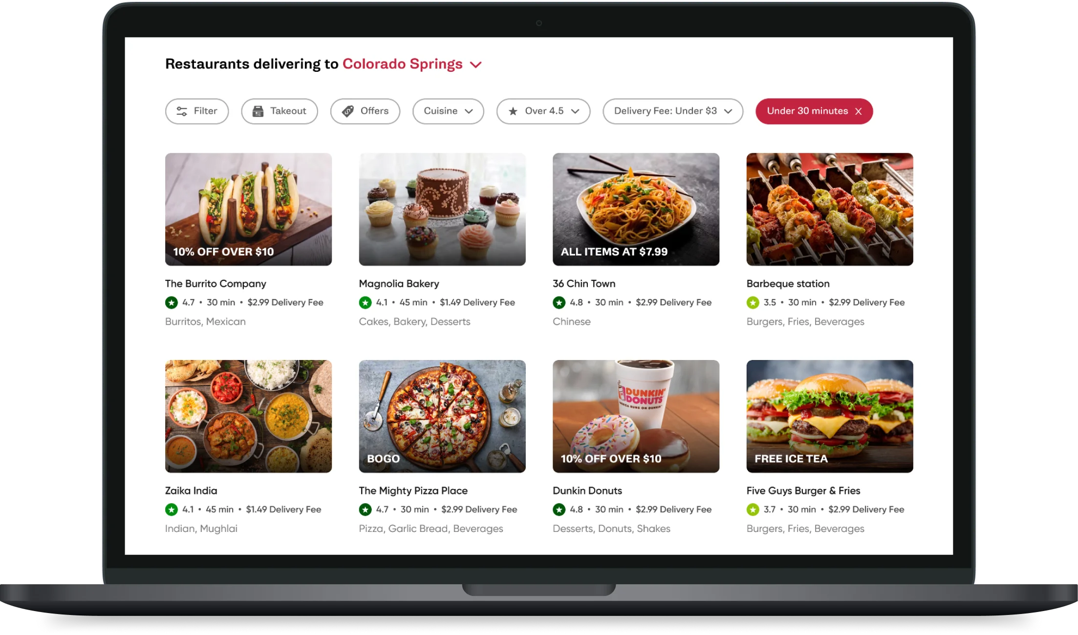 Customers can search by cuisine type, food items, and new and featured hot spots.