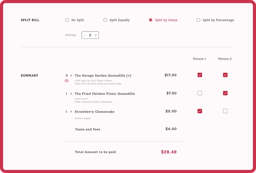 Customize the bill-splitting experience to fit any scenario. Choose to split equally, by individual items, or by percentage, ensuring a smooth and personalized payment process for your customers.