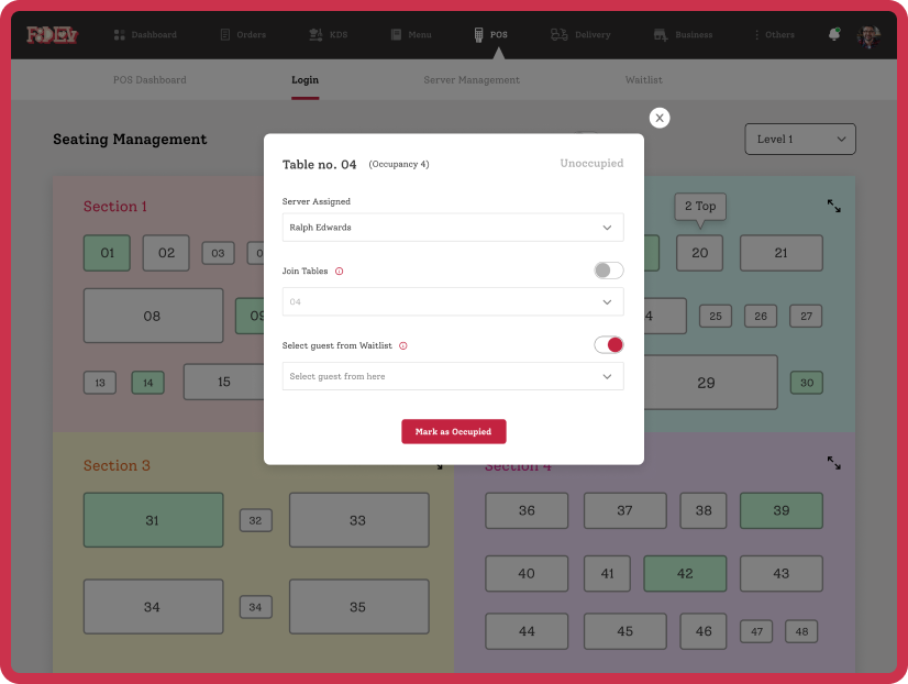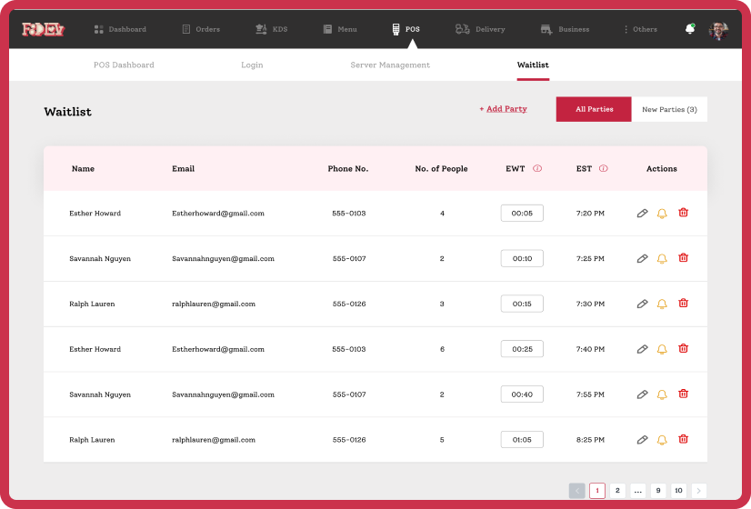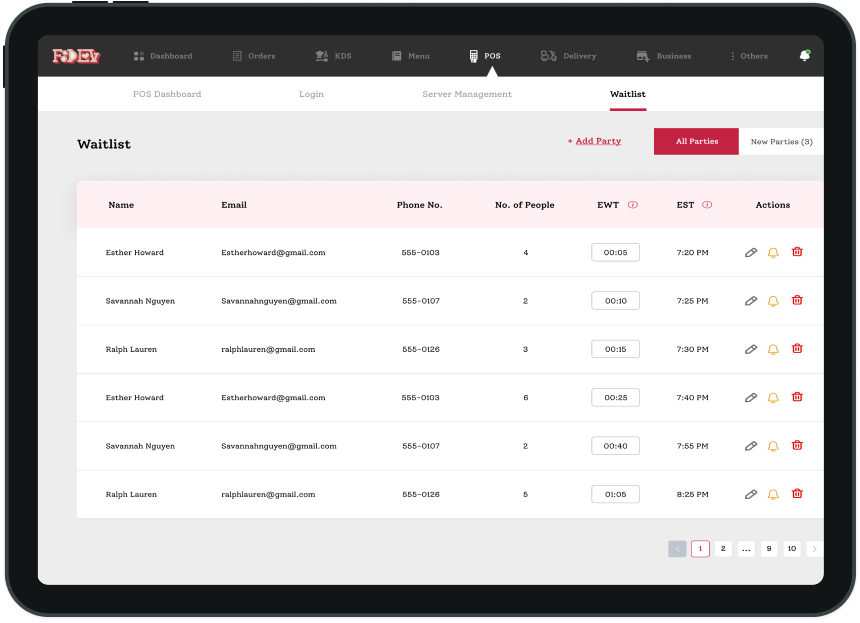 Empower your hosts and hostesses with a comprehensive Waitlist Management view. Track and manage customers on the waitlist, enter estimated wait times (EWT) in minutes, and provide accurate seating predictions, all from a user-friendly table.